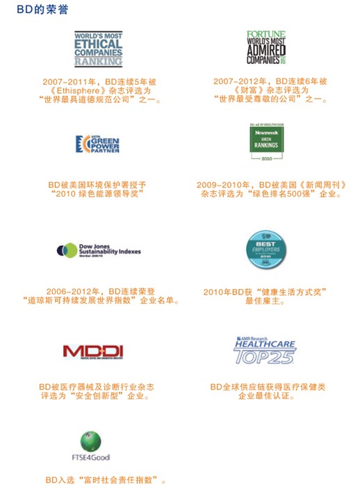 BD也是公认的全球最具社会责任和商业道德的公司,被美国《财富》杂志连续七年评为“全球最受尊敬的公司”之一。BD同时连续多年荣登“道琼斯可持续发展世界指数”企业名单。