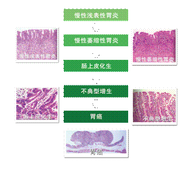 健康的胃在内外因共同的作用下逐渐演变成胃癌的过程很漫长,常为慢性浅表性胃炎→萎缩性胃炎→肠上皮化生→异型增生(不典型增生)→胃癌这样一个缓慢过程。