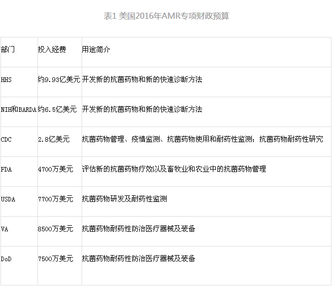 美国高度重视抗菌药耐药性,积极采取应对策略。早在1999年,在美国卫生和公众服务部(United States Department of Health and Human Services;HHS)的牵头下,由10个政府部门组成了一个处理抗菌药耐药性工作组(FDA Task Force on Antimicrobial Resistance,TFAR),由CDC、FDA和NIH共同主持。该工作组于2001年制定了一份“抵抗抗菌药耐药性公共卫生行动计划”。2015年1月,美国政府公布《抵抗抗菌药耐药性(Combating Antibiotic Resistant Bacteria)》专项预算,计划通过HHS投入超过12亿美元,使政府在这一公共卫生危机领域的投资翻了一番,2015年3月,美国政府公布为期5年的抵抗抗生素耐药性国家行动计划,以应对“紧迫而严重的”的细菌耐抗生素威胁。