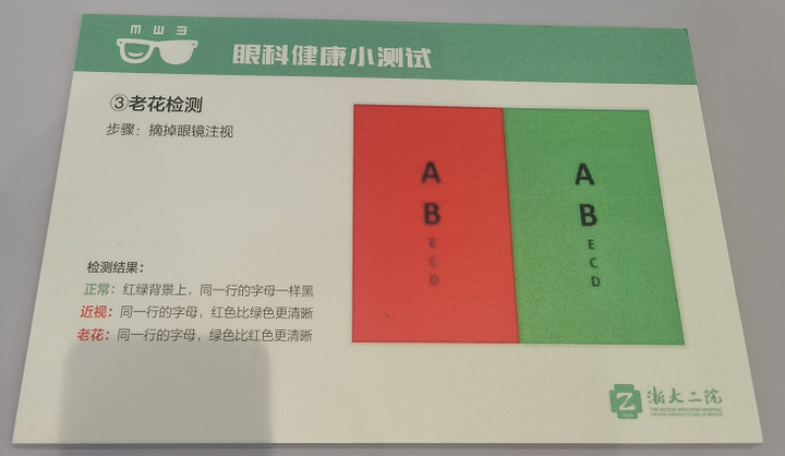 发表日期:2021-10-27摘掉眼镜注视红绿两个色块,对比同一行的字母是否一样清晰,如果存在差异可能提示眼睛有“老花”了。